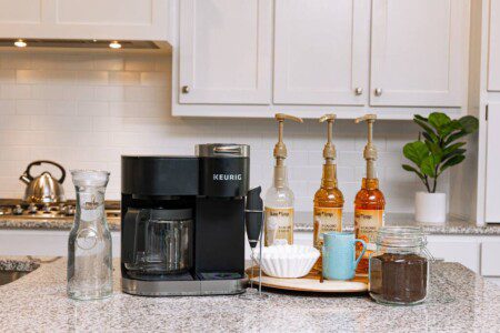Enjoy a variety of coffee and tea options with flavored syrups, milk frother, and hot cocoa.