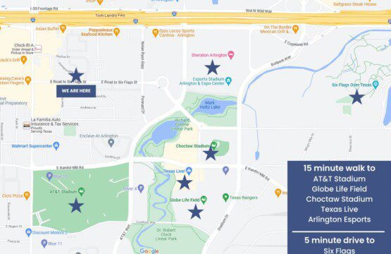 Walk to major attractions like AT&T Stadium, Globe Life Field, Texas Live!, Choctaw Stadium, the Arlington Convention Center, Lowes Hotel, Arlington Museum of Art, and the National Medal of Honor Museum (open Spring 2025). Just 1.5 miles away are Front Street, Urban Union, and downtown Arlington’s shops and restaurants, with UTA also nearby. Perfect for day trips, Fort Worth is 14.4 miles, Dallas 18.5 miles, and the Fort Worth Stockyards 17 miles away.
